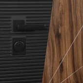 Экошпонированная панель МДФ 10 мм. Цвет "бетон урбан милк". Объемная фрезеровка. Вертикальная вставка из черного лакобеля.