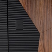 Экошпонированная панель МДФ 10 мм (цвет «белый матовый»). Линейная фрезеровка в современном стиле. Вертикальная вставка из черного глянцевого лакобеля.
