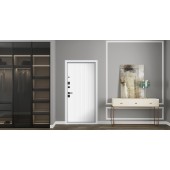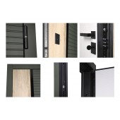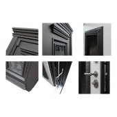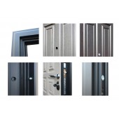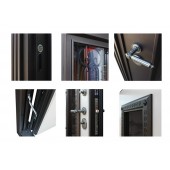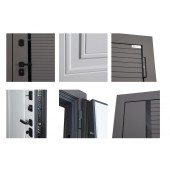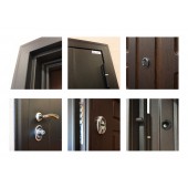 Евроцилиндр К-В (перфокарта). Броненакладка врезная. Штырь противосъемный (3 шт). Порог из нержавеющей стали (цвет "хром"). Скрытый доводчик.