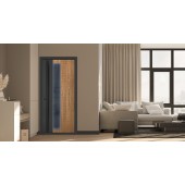 Экошпонированная панель МДФ 10 мм. (Дизайн ФЛС). Цвет «дуб панцифик горизонт". Вставка из черного лакобеля (100 мм).