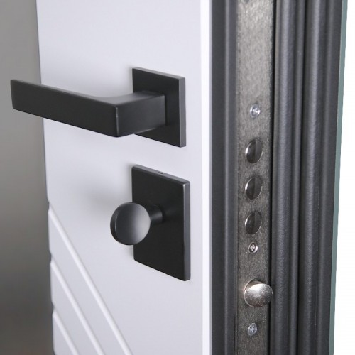 Снаружи ручка–скоба Art 50х25 Inox Basic Mechanical (цвет ral 9005). Внутри ручка RedLine (черный квадрат), ночная задвижка, глазок на квадратной розетке (цвет «черный»). Смотрите также: ДВЕРНЫЕ ГАДЖЕТЫ