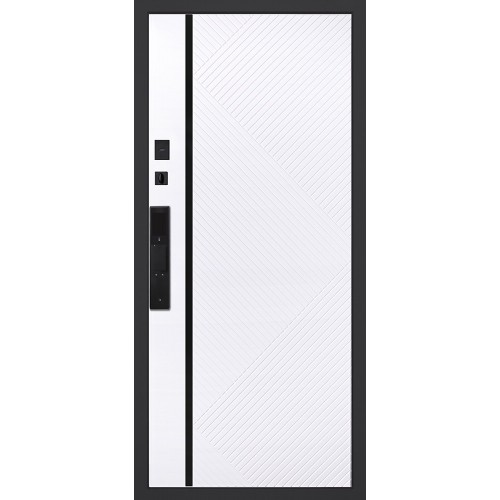 Экошпонированная панель МДФ 10 мм. (цвет «белый матовый».) Объемная фрезеровка. Вертикальная вставка из черного глянцевого лакобеля.