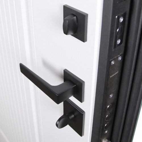 Снаружи: ручка–скоба Art 50*25 Inox Basic Mechanical (цвет ral 9005). Внутри: ручка RedLine, ночная задвижка, глазок на квадратной розетке (цвет «черный»). Смотрите также: ДВЕРНЫЕ ГАДЖЕТЫ