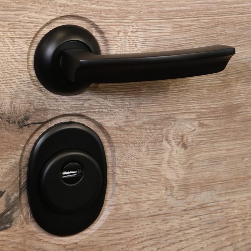 Ручка, глазок, ночная задвижка на круглой розетке. Цвет "черный". Смотрите также: ДВЕРНЫЕ ГАДЖЕТЫ