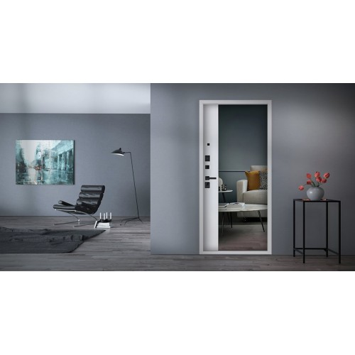 Зетта" с зеркалом - входная дверь, выполненная по дизайнерскому проекту "АСД" для современных многоквартирных домов или частных домов с отапливаемыми тамбурами. Изделие прошло обязательную процедуру заводского контроля, результаты которого показали показа