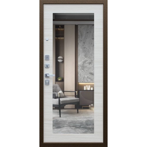Выбрав данную модель двери, вы сразу решаете две проблемы, у вас появится новая входная стальная дверь отличного качества и большое зеркало в доме. Модель «Спартак с зеркалом» выполнена из качественных материалов, лист металла во внешней отделке толщиной 1,5 мм, также это качественные комплектующие. Цвет внешней и внутренней отделки различается, внутри это светлая акация поперечная и большое зеркало практически на всю площадь, а снаружи это сплошной металл в более темном исполнении.