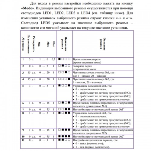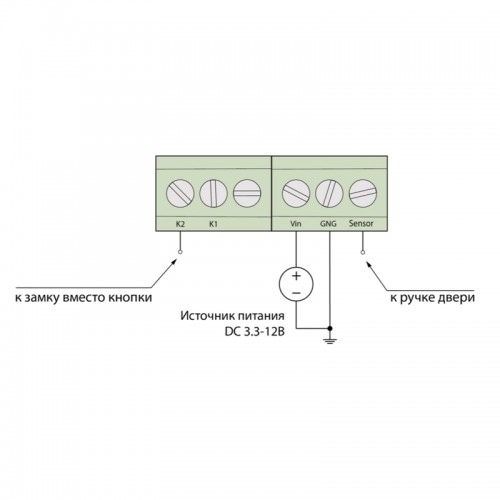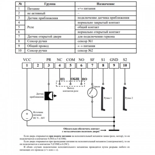 Электронный модуль NoKey предназначен для работы с электромеханическими замками и делает всю "тяговую ручку" (скобу) сенсорной кнопкой.В этом случае для открытия электромеханического замка необходимо просто взяться за ручку. Основное требование: тяговая ручка не должна иметь контакт с металлическим полотном двери.. Назначение и основные сведения. Система бесключевого доступа NoKey предназначена для управления электромеханическими, электромоторными и электромагнитными замками. Суть бесключевого доступа заключается в обеспечении возможности открытия двери за счёт касания человека к токопроводящей части ручки двери. Определяя момент касания, система отправляет сигнал на открытие замка. Для реализации дизайнерских решений система снабжена 2-х канальным модулем управления подсветкой на основе светодиодной RGB ленты, что, к примеру, позволяет организовать подсветку ручки и контура двери.. Требования по монтажу. Для надежной работы системы необходимо обеспечить надѐжный электрический контакт провода от системы к дверной ручке (далее – ручке). Ручка при этом должна быть гальванически развязана (к примеру, установлена через изолятор) с металлическим полотном двери и другими проводами. При этом провод общего потенциала источника питания системы обязательно должен иметь электрический контакт с металлическим полотном двери.Ручка должна быть выполнена из токопроводящего материала (металла) или иметь токопроводящее покрытие (металлизация). На ручке допускается внешняя изоляция (внешнее покрытие из токонепроводящего материала) толщиной не более 0,5 мм. При монтаже системы в дверное полотно требуется размещение провода от двери до системы таким образом, чтобы в процессе эксплуатации двери не происходило его смещение. Для крепления системы рекомендуется использовать крепежные элементы корпуса.. Технические характеристики. Температурный диапазон эксплуатации -20…+50 ℃Степень защиты от воздействия окружающей среды IP20Относительная влажность не более 60%.