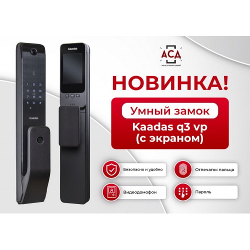 Описание. Kaadas Q3-VP — это обновленная версия биометрического замка Kaadas Q3 с видеонаблюдением и 4-дюймовым IPS-экраном на внутренней панели замка.. Kaadas Q3-VP оборудован встроенным дверным звонком. Теперь вам не потребуется установка дополнительного устройства для оповещения о приходе гостей. Необходимо коснуться значка дверного звонка над областью ввода кода, после чего замок прозвенит дважды. Этой уникальной функцией оснащены немногие замки на рынке в данном ценовом сегменте.. Передняя панель замка оснащена HD-камерой: сверхширокоугольный объектив 144° и разрешение изображения HD 1080P. На внутренней панели расположен 4-дюймовый IPS-экран: при нажатии на дверной звонок на экране будет отображаться то, что происходит за дверью (отслеживание также доступно в мобильном приложении). Для просмотра внешней обстановки достаточно одного касания кнопки под экраном.. Благодаря интеллектуальным способам открытия вам больше не стоит беспокоиться о забытых ключах. Вы можете открыть замок при помощи отпечатка пальца, ПИН-кода и RF-карты. Механический ключ используется в аварийных случаях.. Использование шведской технологии Fingerprint Cards позволяет распознавать отпечатки пальцев с помощью 3 датчиков: температуры, емкости и давления, что полностью предотвращает их подделывание. Распознавание отпечатка происходит за 0,5 секунды. Независимо от того, в каком вы держите палец, отпечаток легко распознать. Эта технология применяется более чем в 135 банках по всему миру.. Важные функции безопасности Kaadas Q3-VP:. . Защита от подбора кода: замок выводит до 32 случайных символов до и после реального кода, чтобы следы от пальцев на дисплее распределялись равномерно и оставались не только на тех цифрах, из которых состоит код доступа. Двойная аутентификация: комбинация нескольких способов открытия. Предупреждение о попытке взлома: замок активирует звуковую сигнализацию и временно отключит замок, если злоумышленник намеренно откроет замок или введет неправильный пароль более 5 раз. Кнопка блокировки изнутри делает невозможным открытие замка снаружи (кроме мастер-кода). Аккумуляторная батарея емкостью 4200 мАч обеспечивает экологичность использования. . Цилиндр является самой важной частью дверного замка. Kaadas оснастил Q3-VP цилиндром типа C — высший уровень сертификации дверных замков с точки зрения безопасности и долговечности. . Kaadas Q3-VP покоряет покупателей своим гармоничным дизайном и прочной конструкцией.. В покрытии замка использована технология IML для устойчивости к царапинам, износостойкости и простоты очистки во время использования.. Замок пригоден для установки на широкий размерный ряд дверей. Очень популярен в крупных проектах, таких как оснащение офисов и квартир в жилых комплексах.. Умный замок Kaadas Q3-VP с распознаванием отпечатков пальцев способен обеспечить максимальную безопасность в вашем помещении.